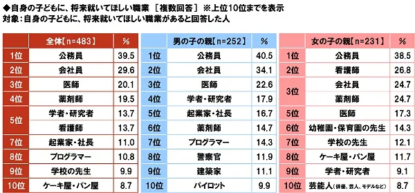 ◆子どもに就いてほしい職業 1位「公務員」、男の子の親では研究職、女の子の親には医療系や教職などが人気