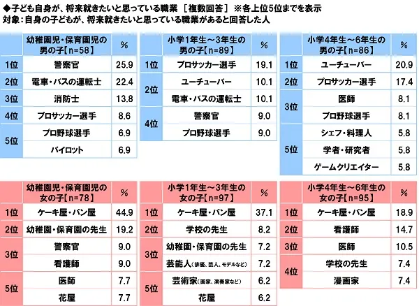 自身の子どもが将来就きたいと思っている職業があると回答した人(503名)の回答結果をみると、1位「ケーキ屋・パン屋」(19.7%)、2位「ユーチューバー」(8.2%)、3位「警察官」「プロサッカー選手」(同率7.8%)となりました。