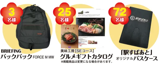 キャンペーン期間中に最新の「駅すぱあと」をご購入いただいた方の中から、抽選で100名様にグルメギフトカタログやバックパックなどの豪華プレゼントが当たります。詳細は特設サイトよりご確認いただけます。