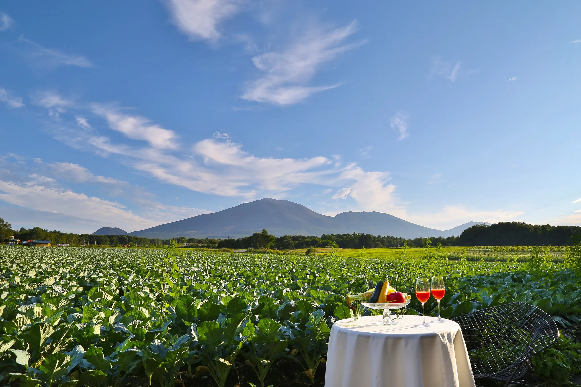最終日の朝、野菜畑へ案内します。一面の夏野菜が実る畑の隅に設けられた席にて、シャンパン(又は野菜のホットスムージー)を手に、雄大な大地が広がる景色を眺めます。また、畑から野菜を収穫する体験も行います。豊かな土の香り、野菜の力強さを感じる非日常の時間を過ごすことができます。