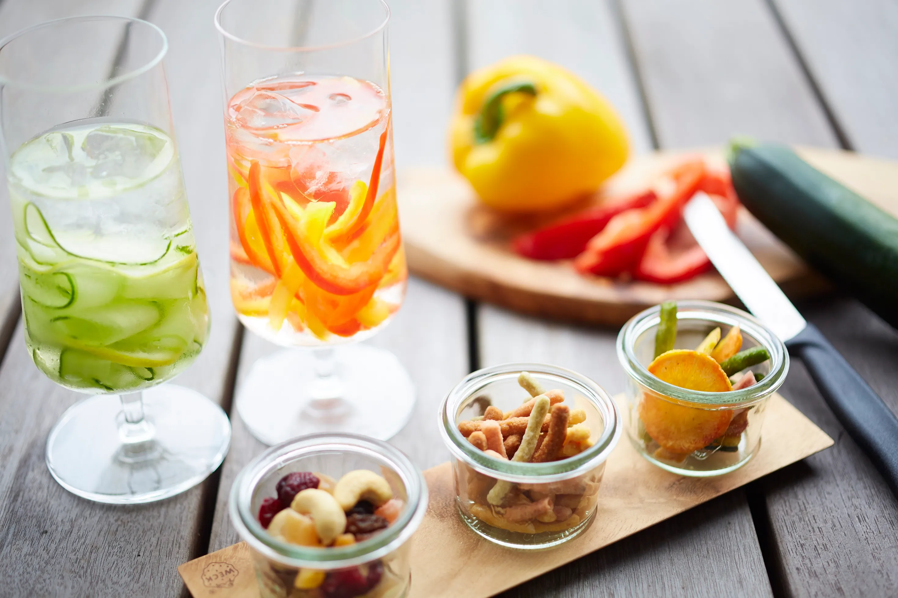 湯上がりには、部屋に常温の野菜ウォーターを用意します。ビタミンやカリウムなど野菜に含まれる栄養素を摂り入れながら、身体の中を潤します。おつまみとして、野菜チップスやドライフルーツも提供します。