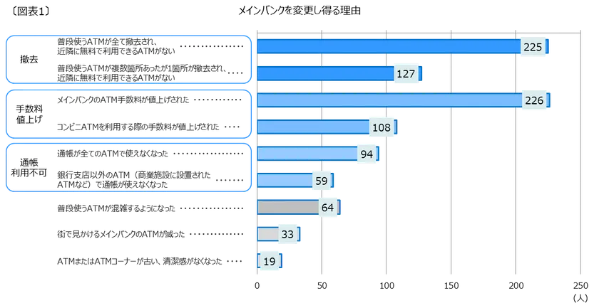 ・メインバンクを変更し得る理由のうち、「ATMの撤去」と「手数料値上げ」が大半を占める