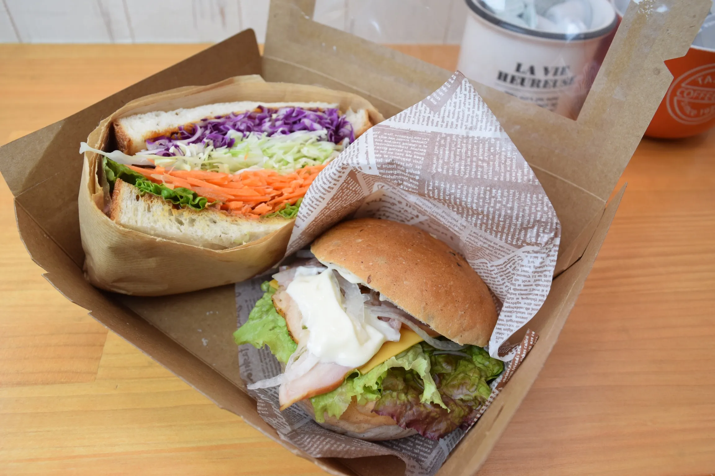 枚方保健所監修「ひらかた健康サンド」は、当店人気の古代米を使ったバーガーと玄米を練りこんだ食パンを使い、彩り野菜が入ったバランスよいランチBoxです。