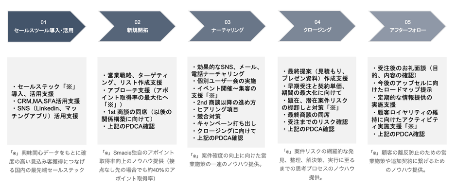 社内外の元/現役 ITトップセールスメンバーが推奨するセールスツールの導入や活用支援、セールスツールとヒューマンスキル、ナレッジを組み合わせた新規開拓からナーチャリング、クロージング、アフターフォローに至る網羅的なIT企業特化型セールスイネーブルメントコンサルティングを実施。幅広いIT業界の企業で活躍してきたトップセールスの営業ノウハウや成功パターン「Smacie Methodology」をもとに、人口減少下におけるセールス領域の課題解決に繋げていただけます。
