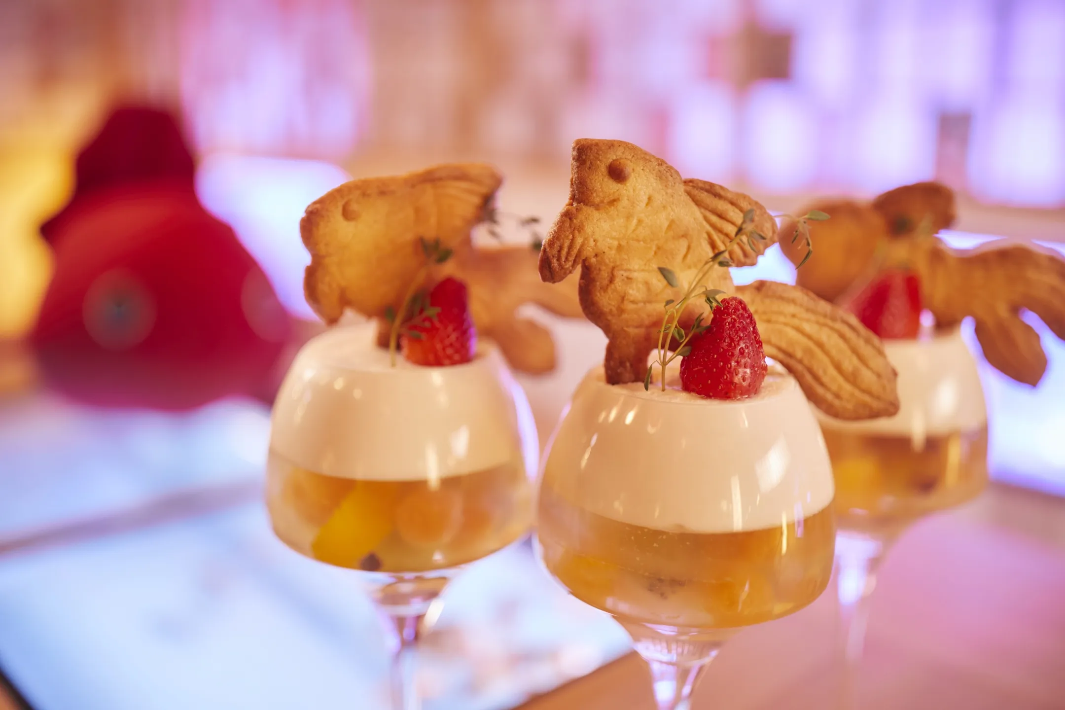 デザートは、金魚型のクッキーを添えたグラスデザート「金魚シードルムース」です。果物たっぷりのゼリーと、シードルを使用したムースの2層仕立てになっており、大人な味わいを楽しめます。
