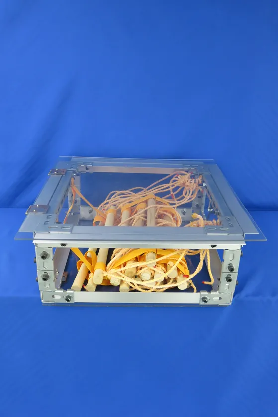 収納状態の斜楽を高所に設置して下ブタを開放すると、回転落下しつつ縄バシゴの各所が、斜張ロープによって次々と定位置に保持されて一瞬にして縄バシゴ全体が斜張展開され、安定的に昇降可能になる。