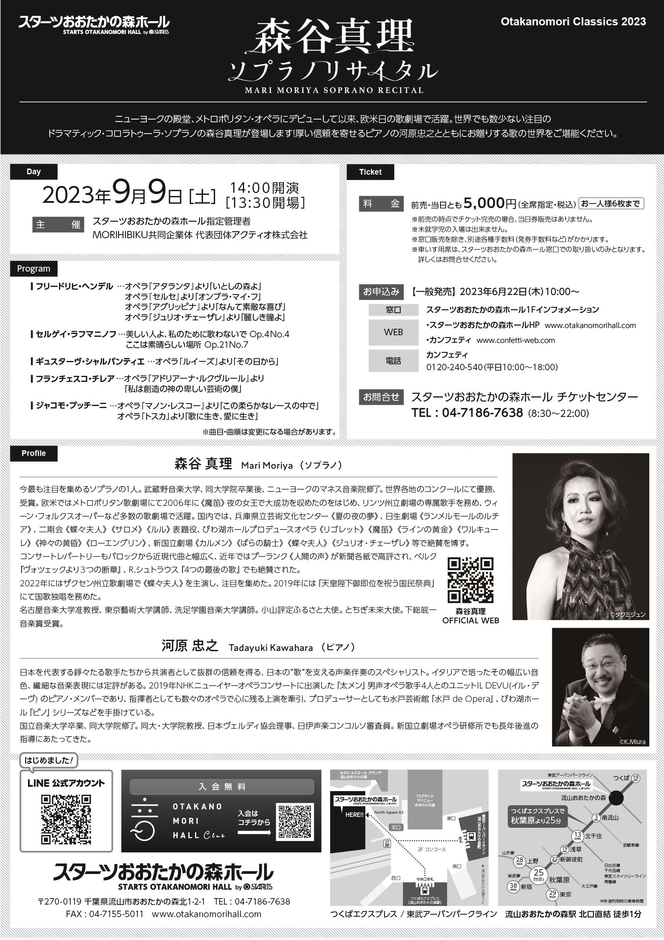 スターツおおたかの森ホール主催『森谷真理ソプラノリサイタル』が2023年9月9日(土)にスターツおおたかの森ホール(千葉県流山市)にて開催されます。チケットはカンフェティ(運営:ロングランプランニング株式会社、東京都新宿区、代表取締役:榑松 大剛)にて6月22日(木)より発売です。