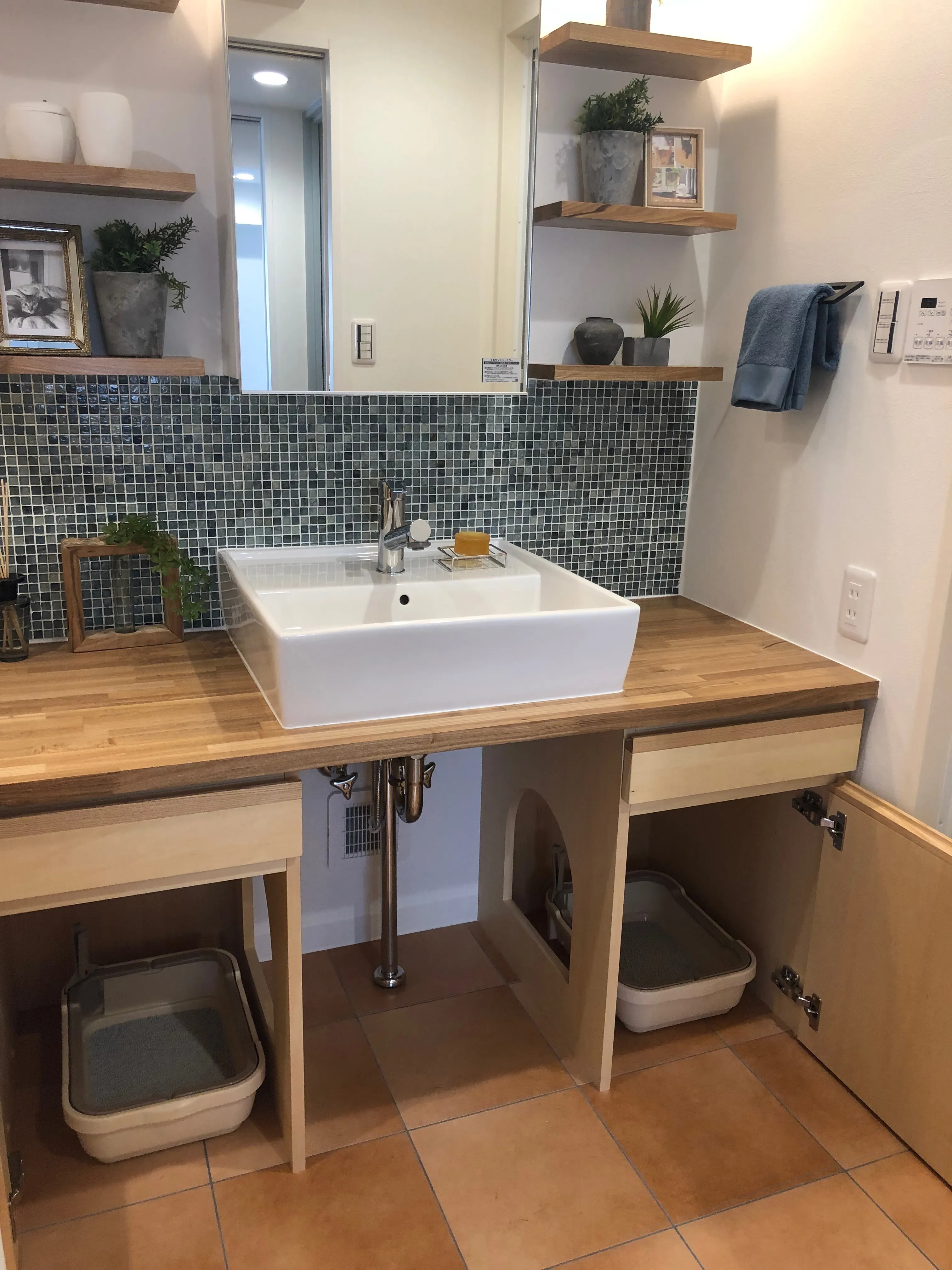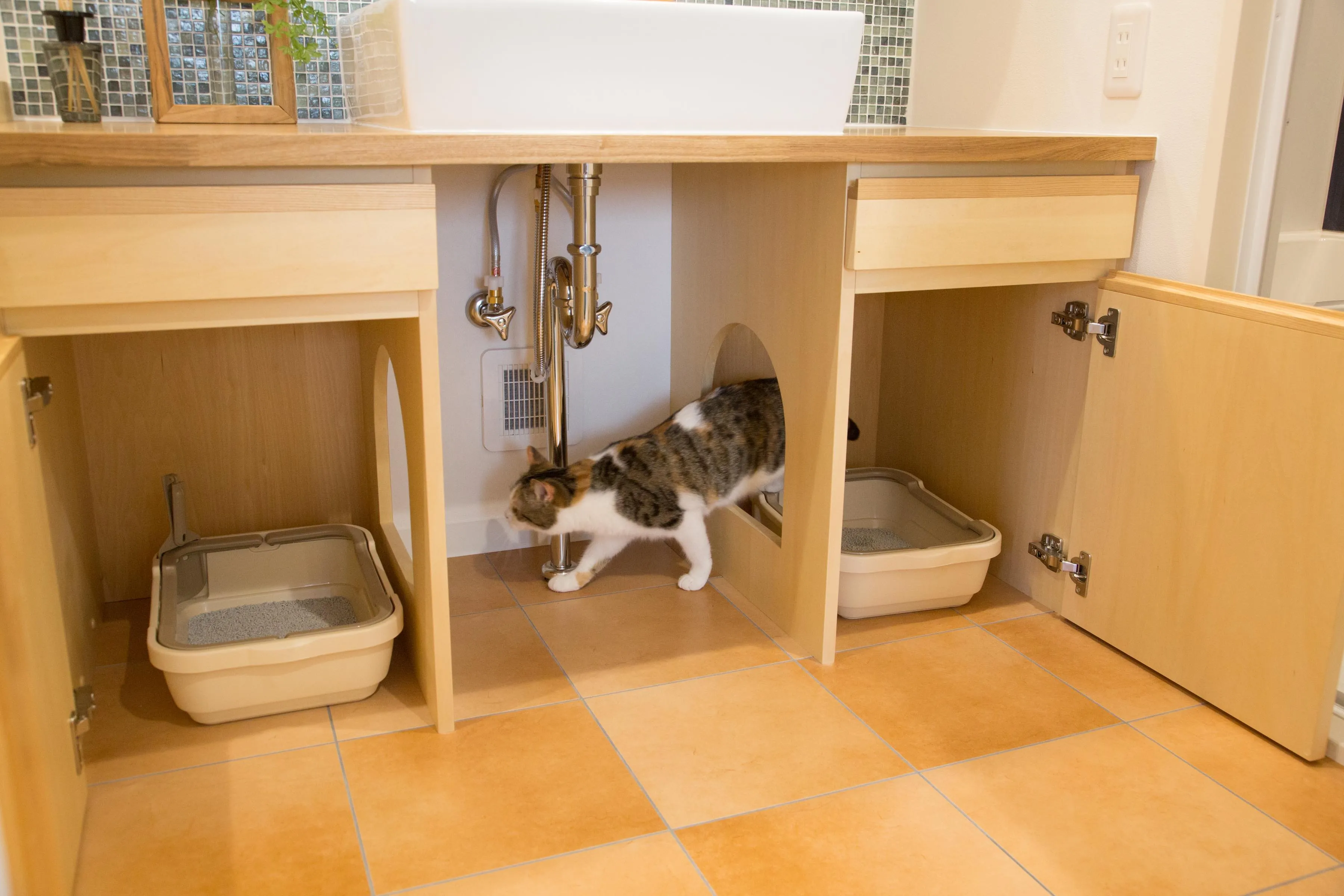 オリジナル洗面台の「マイリノ洗面台」には猫用トイレコーナーを設けています。猫用トイレを収納したまま使用でき、見た目もすっきり美しく掃除も簡単です。床面は汚れに強いフロアタイルを使用しています。