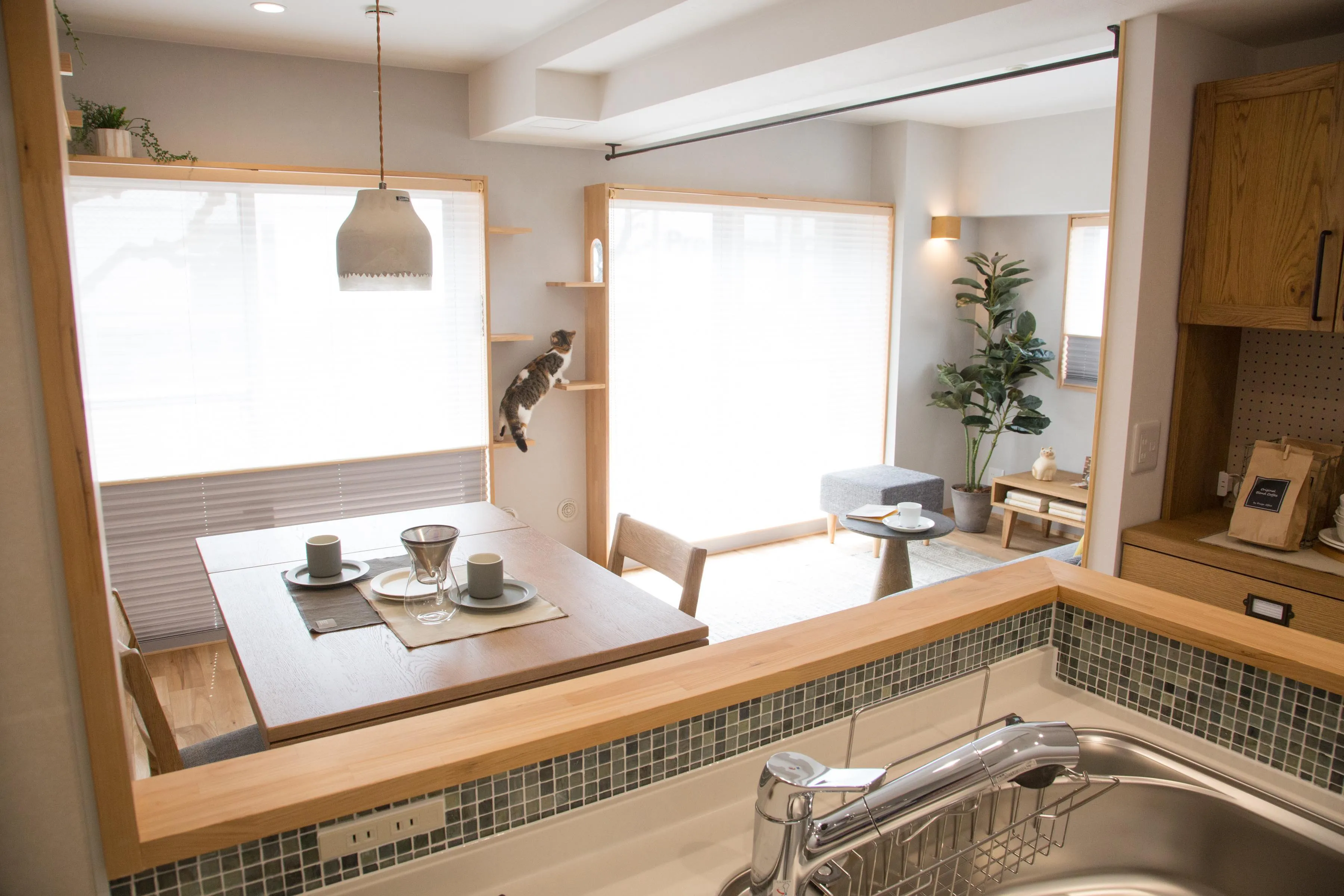 キッチンからもキャットスペースからもお部屋全体が見渡せるような設計をしています。飼い主と猫が互いの目線が届く導線をつくり、常にお互いの存在が感じられるようにしています。