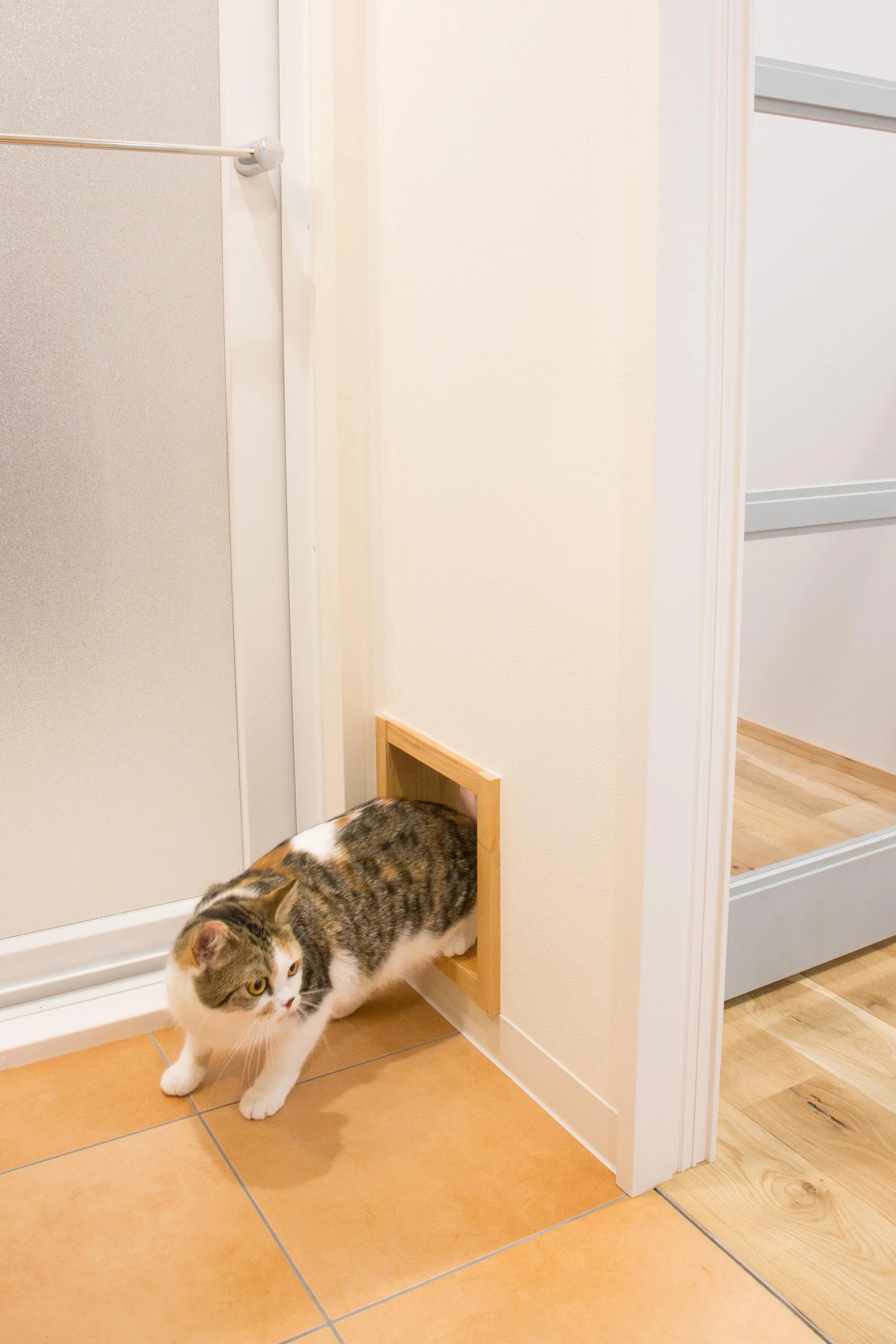また、猫トイレのある洗面室は、猫がいつでも使えるように、猫専用の入り口を作っています。