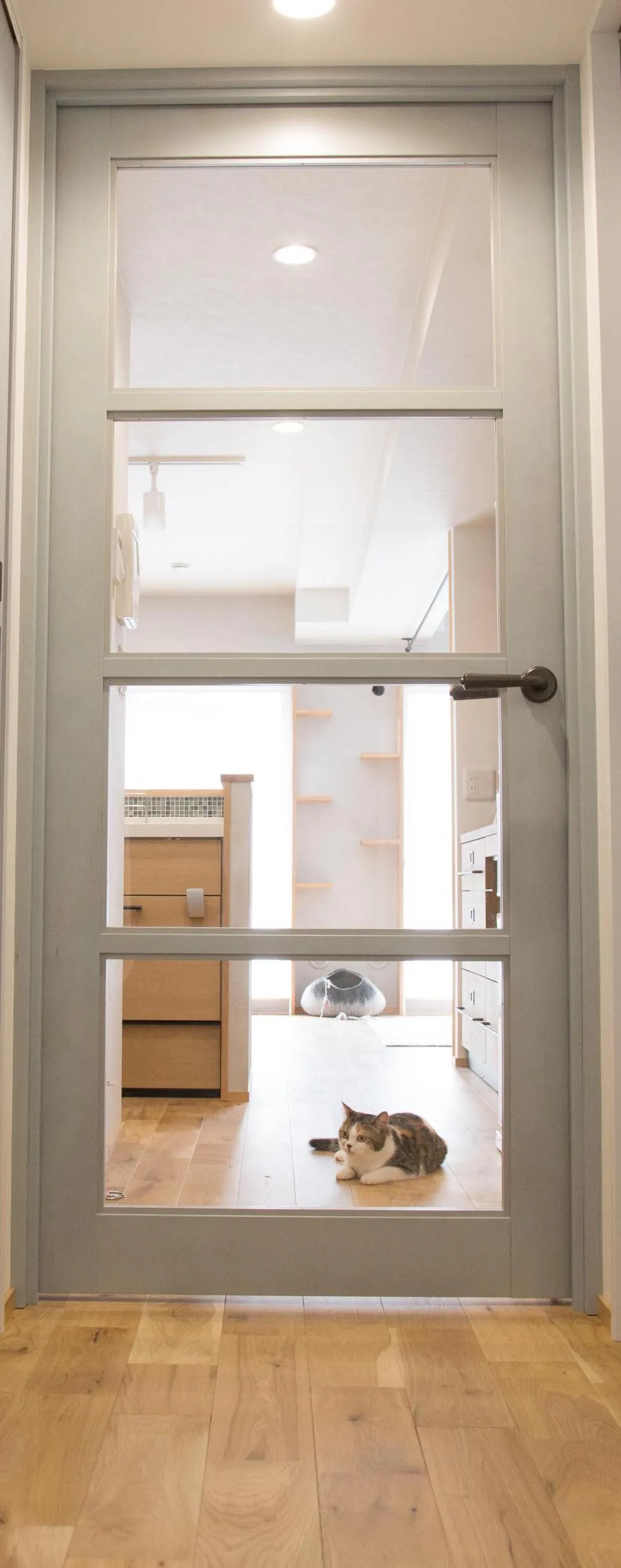 玄関ドアを開けた際に猫が飛び出して行かないよう、セーフティネットとしての脱走防止戸を設計の中に組み込んでいます。