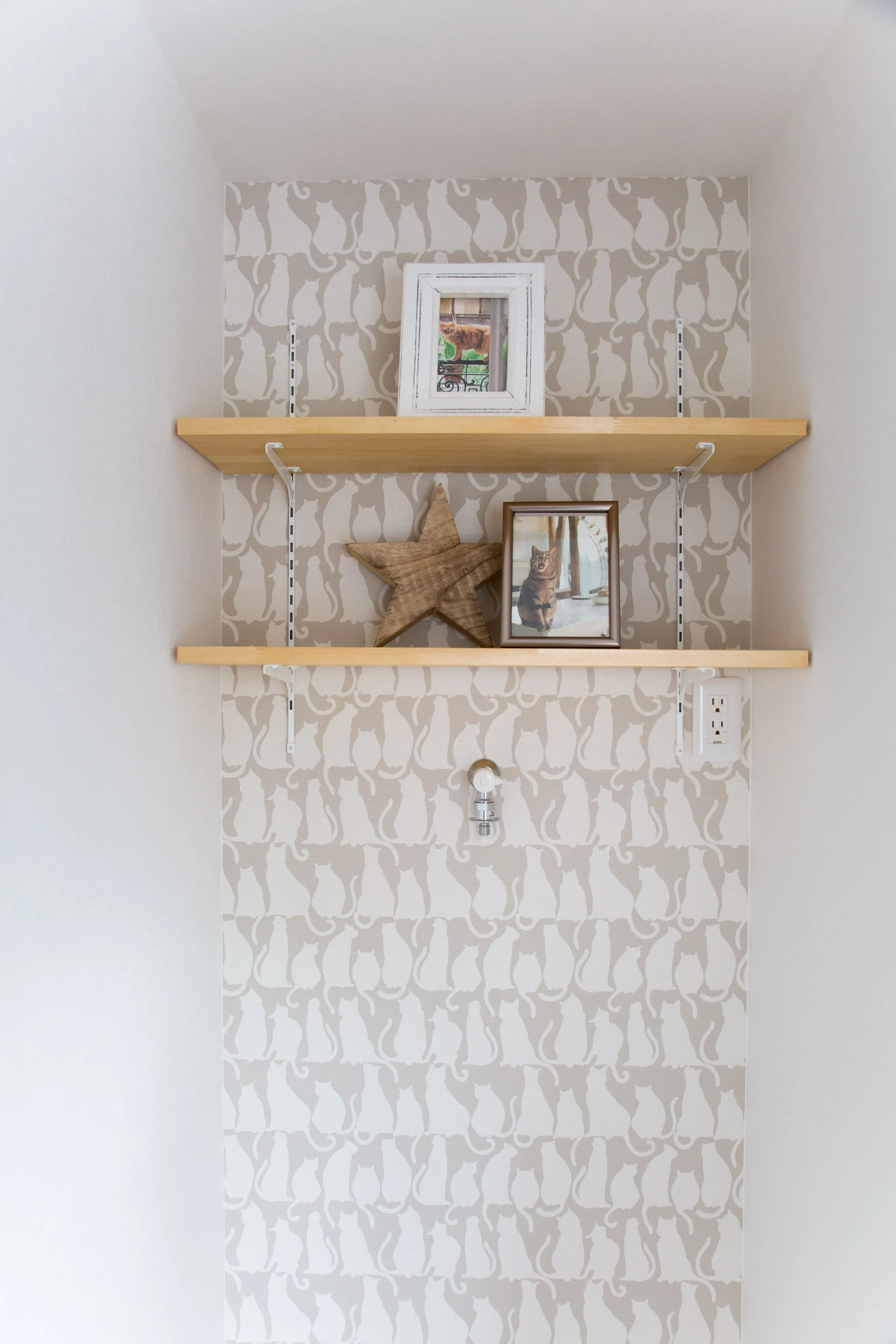 田向獣医師監修の汚れやひっかき傷に強いクロスを壁に採用しています。また、洗濯室の一部には猫柄クロスをアクセントに使用しました。