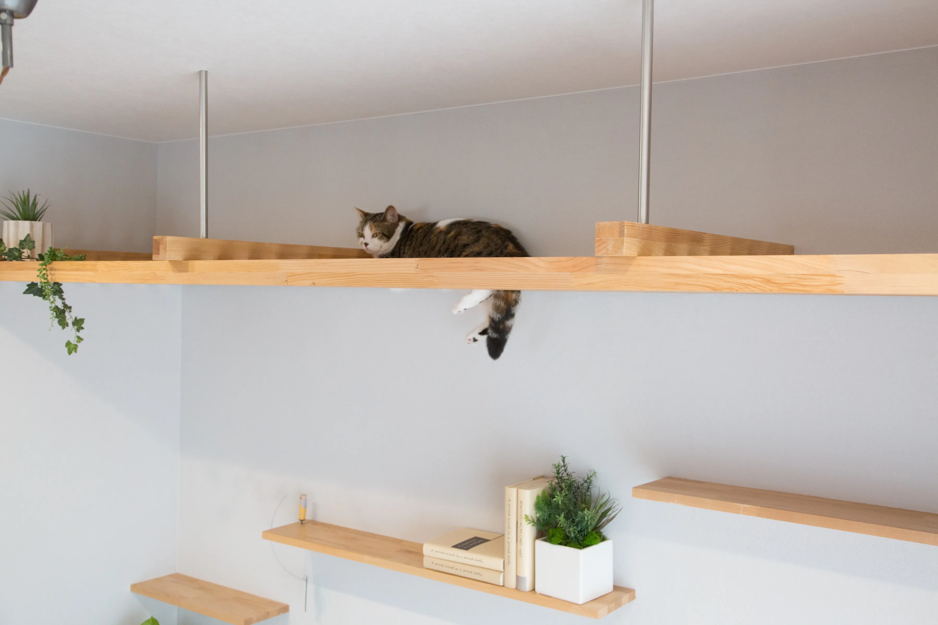 「マイリノキャットルーフ」は、部屋と一体化した猫のための天井スペースです。縦運動が好きな猫が、壁と天井を自由に行き来できるようにし猫の運動不足を解消します。また、人見知りな猫が安心して隠れられる居場所としても機能します。