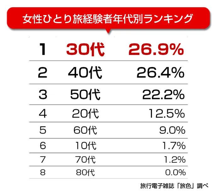カラオケや焼肉など“おひとり様”専門店が人気を集め、これまでのネガティブなイメージから、ポジティブなイメージに変わりつつある「ひとり○○」。大人の女性に上質な旅を提案してきた電子雑誌「旅色」では、創刊間もない時期から「ひとり旅」に注目し、さまざまな特集を展開してまいりました。このたび、「旅色プレゼントの日」として毎月“5”のつく日(5・15・25日)に開催しているプレゼントキャンペーンで実施した、「ひとり旅」に関するアンケート調査の結果を発表いたしました。