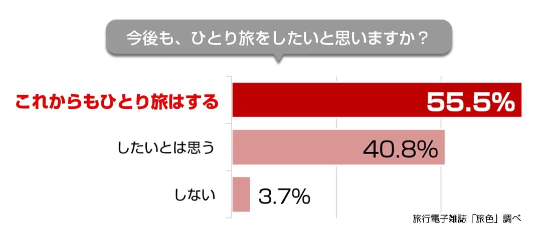 これからも「ひとり旅」をしたいと思いますか?という質問には、96.3%の方が「する・したいと思う」と回答し、「しない」と答えた方はわずか4%以下。「ひとり旅」をしたことがない方でも、60%の方が「してみたいと思う」という結果になり、「ひとり旅」には一定のニーズがあることがうかがえます。