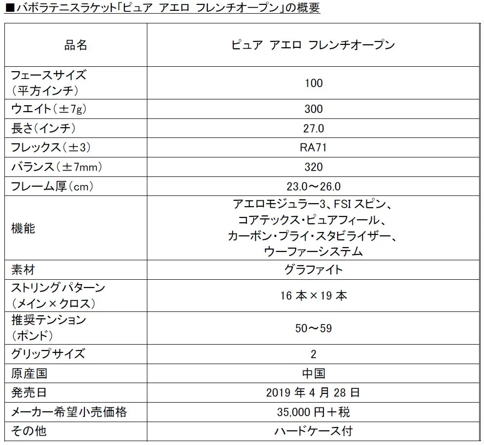 住友ゴムグループの(株)ダンロップスポーツマーケティングは、日本での販売総代理店契約(ウエアを除く)を締結しているバボラVS社の「全仏オープン」とのコラボレーションラケット「ピュア アエロ フレンチオープン」※を4月28日から数量限定で新発売します。メーカー希望小売価格は、35,000円+税です。