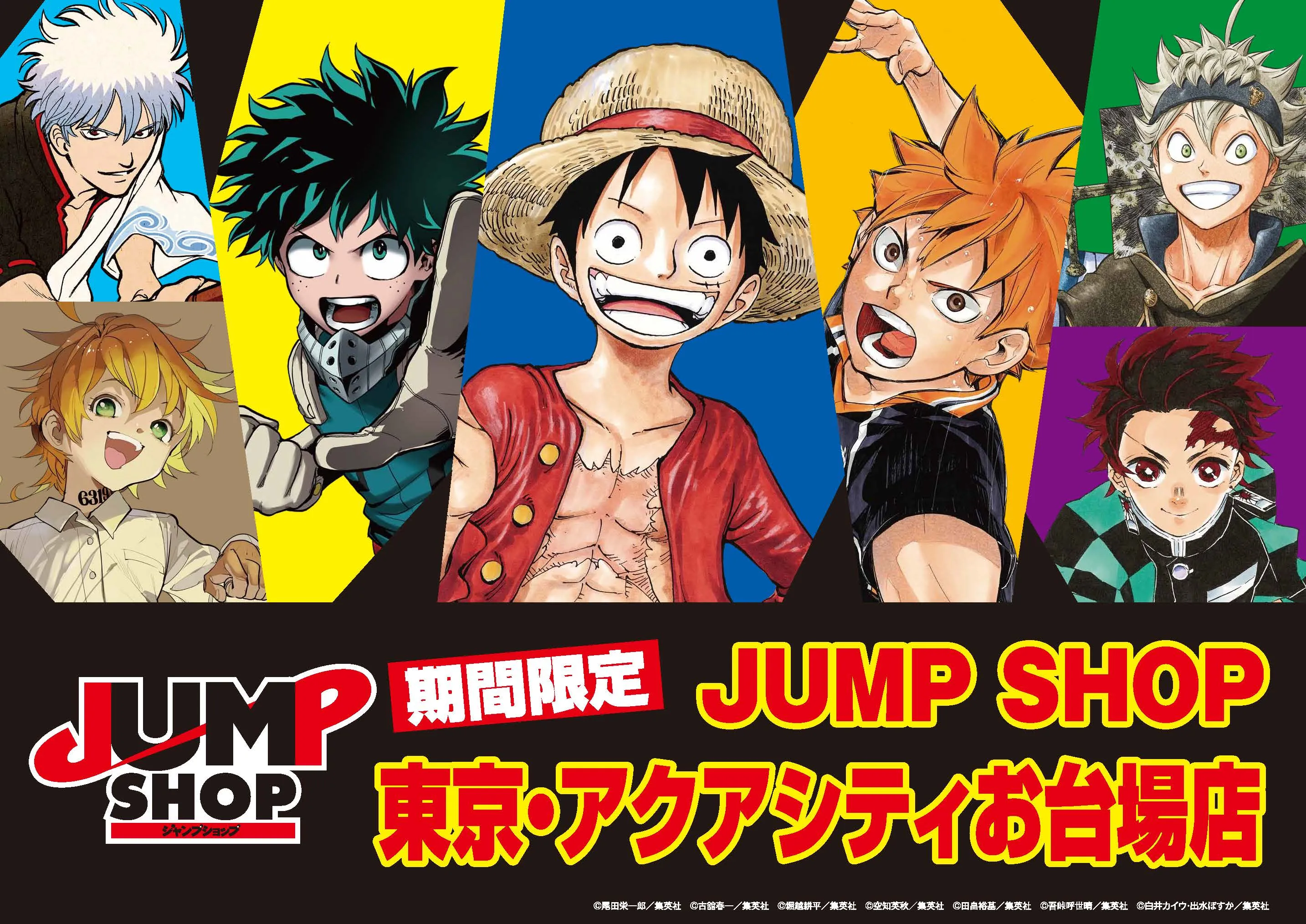 毎年夏に開催し、2018年には延べ3万人を超えるお客様にご来場いただいた「JUMP SHOP」が、2020年2月まで期間限定でオープン!『ONE PIECE』や『ハイキュー!!』、『僕のヒーローアカデミア』など「週刊少年ジャンプ」連載中の人気作品をはじめとした原作グッズを中心に販売します。さらに、ファンにはたまらない「JUMP SHOP東京・アクアシティお台場店」限定グッズも販売予定です。