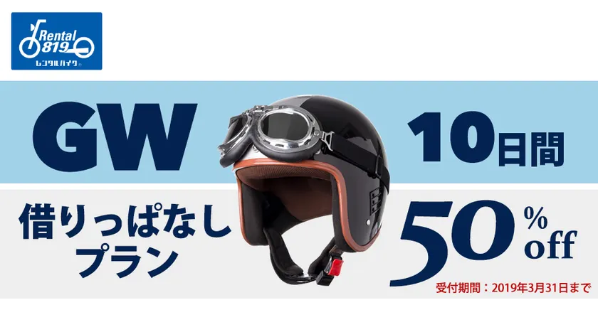 初の10連休に合わせて、レンタル819ではロングツーリングしたいバイカーのために【ゴールデンウィーク10日間 借りっぱなしプラン】を実施。プランの内容は4月26日(金)または4月27日(土)にレンタルスタート、返却は5月6日(月)と利用開始と返却日が固定になります。受付期間は3月31日(日)までが対象となり予約期間の9日間もしくは10日間を、大型割引50%引きで利用できます。予約の際には公式サイトに掲載されているクーポンコードが必要となります。