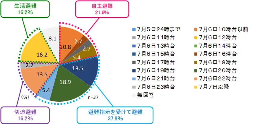 ・19時40分の「大雨特別警報」「避難指示」の手前までで避難を考え始めたと回答した人は10.6%、19時40分の「大雨特別警報」「避難指示」までを累計すると24.5%である。