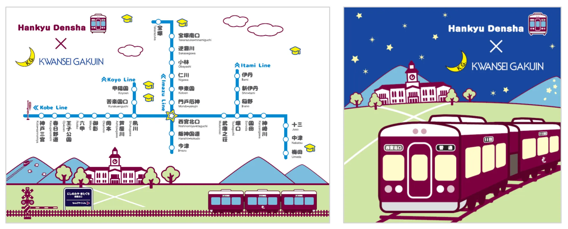 グッズのラインナップは、ボールペンやシャープペンシル、リングノートなど、実用的なステーショナリーを中心とした全13アイテム。これらは、新キャンパスの最寄り駅である阪急西宮北口駅を中心とした路線図や、関西学院西宮上ケ原キャンパスのシンボルである時計台と中央芝生に関西学院のイメージカラーである「関学ブルー」の夜空の下を走る電車を組み合わせたデザインとするなど、阪急電鉄と関西学院をイメージしたものになっています。