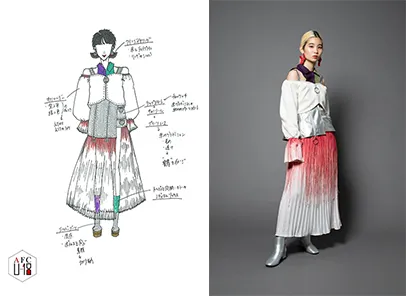 デザインコンセプト:自分自身が今年高校を卒業して19歳になる年。大人として見られることが多くなるが、女性と女の子のちょうど狭間なため、「かっこいい女性」と「可愛い女の子」をミックスしている。裾の広がり具合や動きのシルエット、色やフリルの素材と大きさなどのバランスにこだわっている。