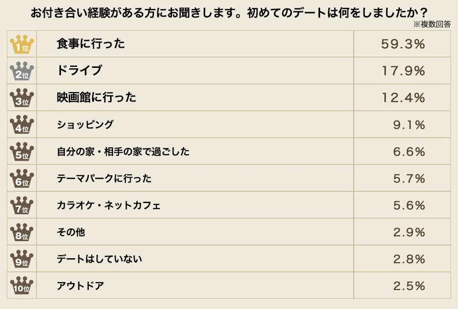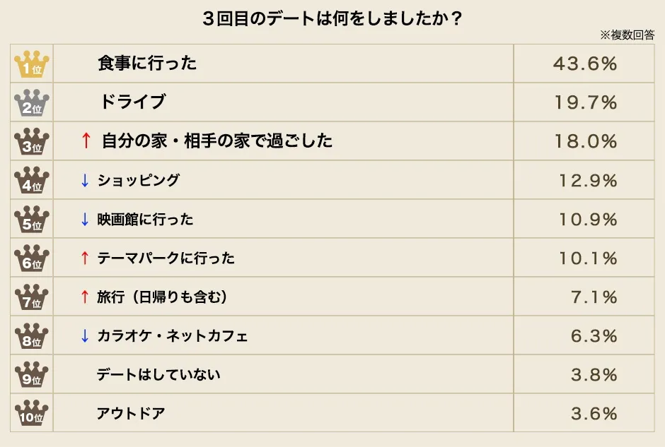 「食事」と「ドライブ」が、ほとんどのカップルが早い段階で経験するデートの「初心者コース」だとするなら、3回目のデートで急浮上した「家で過ごした」の項目は一気にふたりの距離が近づく、デートの「中級者コース」と言えるのかもしれません。 お付き合いをはじめたばかりの高揚感がやや冷めて、ふたりが一緒に時を過ごすためのリアルな日常を意識しはじめる。今回の調査結果では、そんな意識が隠れているのかもしれません。