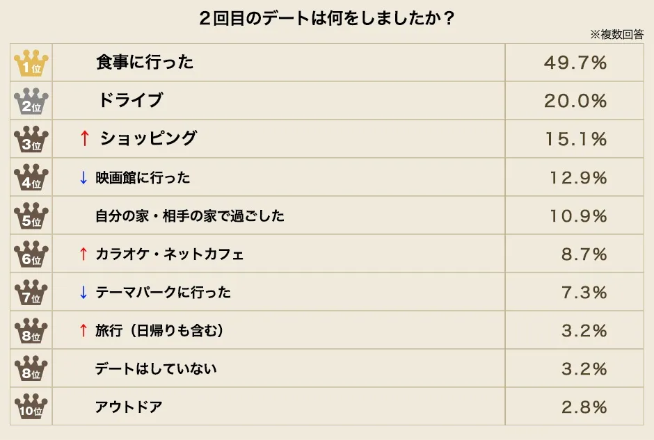 1位と2位は不動の定番デート!? デートに慣れてきた2回目・3回目は3位の項目に変化が!