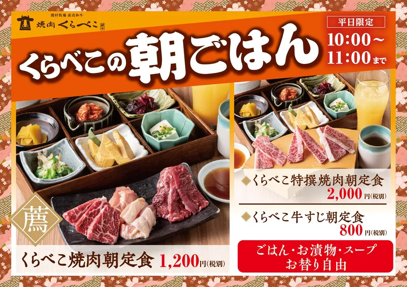 大阪狭山市の焼肉店「焼肉くらべこ」では、毎週月曜日から金曜日、午前10時から11時の1時間、平日限定で【焼肉朝定食】を本格的に導入することを決定いたしました。来月で提供開始から半年を迎える【焼肉朝定食】は、白ご飯、お漬物、スープ、ソフトドリンクがお替り自由で、朝から焼肉スタイルの黒毛和牛特撰肉を提供いたします。