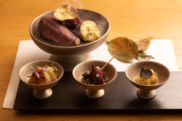 充分な甘みが特徴の薩摩芋をそのままじっくりと火を通した焼き芋と、薩摩芋をフォアグラ、マデラソースを合わせ、薩摩芋の皮をパン粉に使用した「薩摩芋とフォアグラのコロッケ」を提供します。また、マヨネーズとあわせ、ポテトサラダのように仕上げた「薩摩芋のレムラード」と、「薩摩芋の焼きリゾット」には味噌や、いぶりがっこを使用するため、日本酒との相性も抜群です。8月から収穫が始まる薩摩芋ですが、美味しく食べることができるのは、収穫から2~3ヵ月たち水分が抜けた状態といわれています。甘味をより一層引き立たせる仕立てで堪能します。
