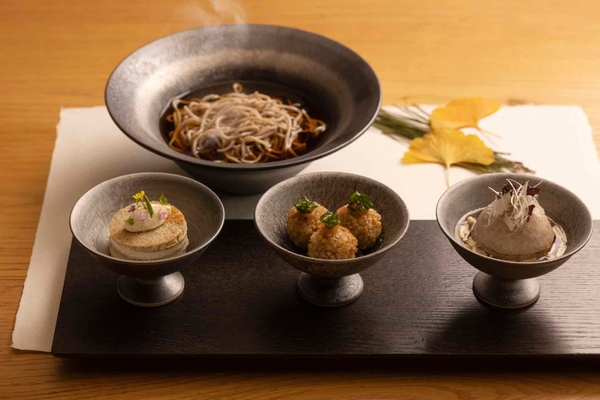 新そばを使用した、今も昔も変わらない、かけそばというシンプルな食べ方と、鴨南蛮そばから着想を得た「そばがきの鴨コンソメ」を提供します。この料理は、そばがきをフリットにし、揚げ出し豆腐のように鴨のコンソメをかけ、新そばの風味をふんだんに感じることのできる一品です。また、旬の新そばをふぐの卵巣の糠漬けとクリームチーズをあわせた「そば粉のブリニ」とトリュフの香りを添えた「鴨とそばの実のカイエット」にして用意します。