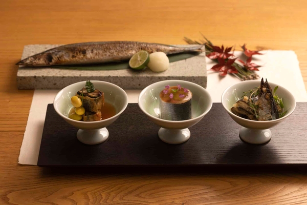 「目黒の秋刀魚」の噺に合わせ、炭火で焼き、大根と醤油を合わせた秋刀魚と、現代の調理法で仕立てた秋刀魚を提供します。9月から10月にかけて出回る産卵前の秋刀魚は、脂がのってしっとりとしています。頭から骨まで美味しく食べることのできる「秋刀魚コンフィの炭火焼き」は、旬の秋刀魚がもつ滋味を感じられる一品です。塩麹でマリネし、ゆっくりと低温の油でコンフィした旬の秋刀魚を、炭火であぶります。また、ポルチーニ茸をあわせた「秋刀魚とポルチーニ茸の東寺揚げ」と秋ナスと酢で〆た「秋刀魚のルーロー」を提供します。