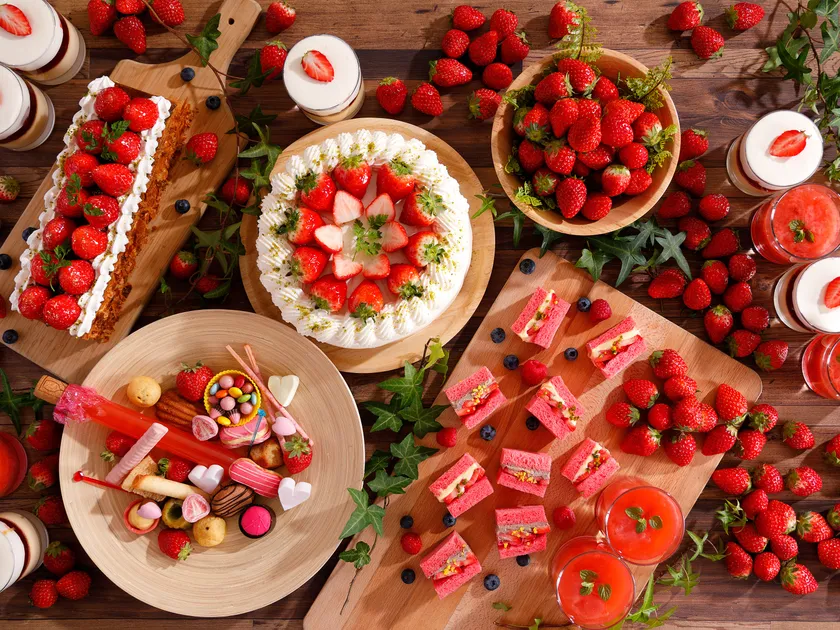 デザートには、フレッシュいちごを食べ放題でご提供いたします。チョコレートファウンテン、自分で作るいちご大福など、各レストランこだわりの食べ方をご提案しております。