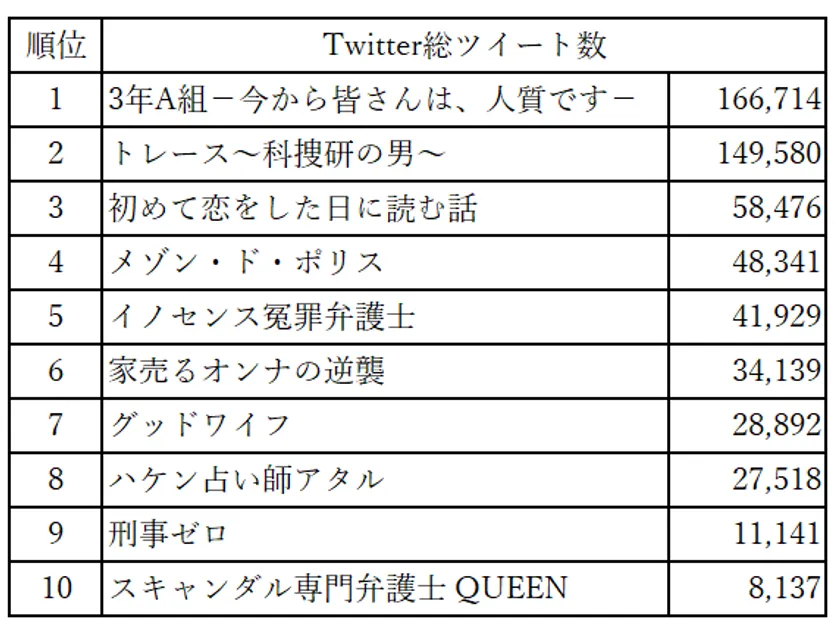 1.総ツイート数1位は「3年A組 ―今から皆さんは、人質です―」の166,714件。