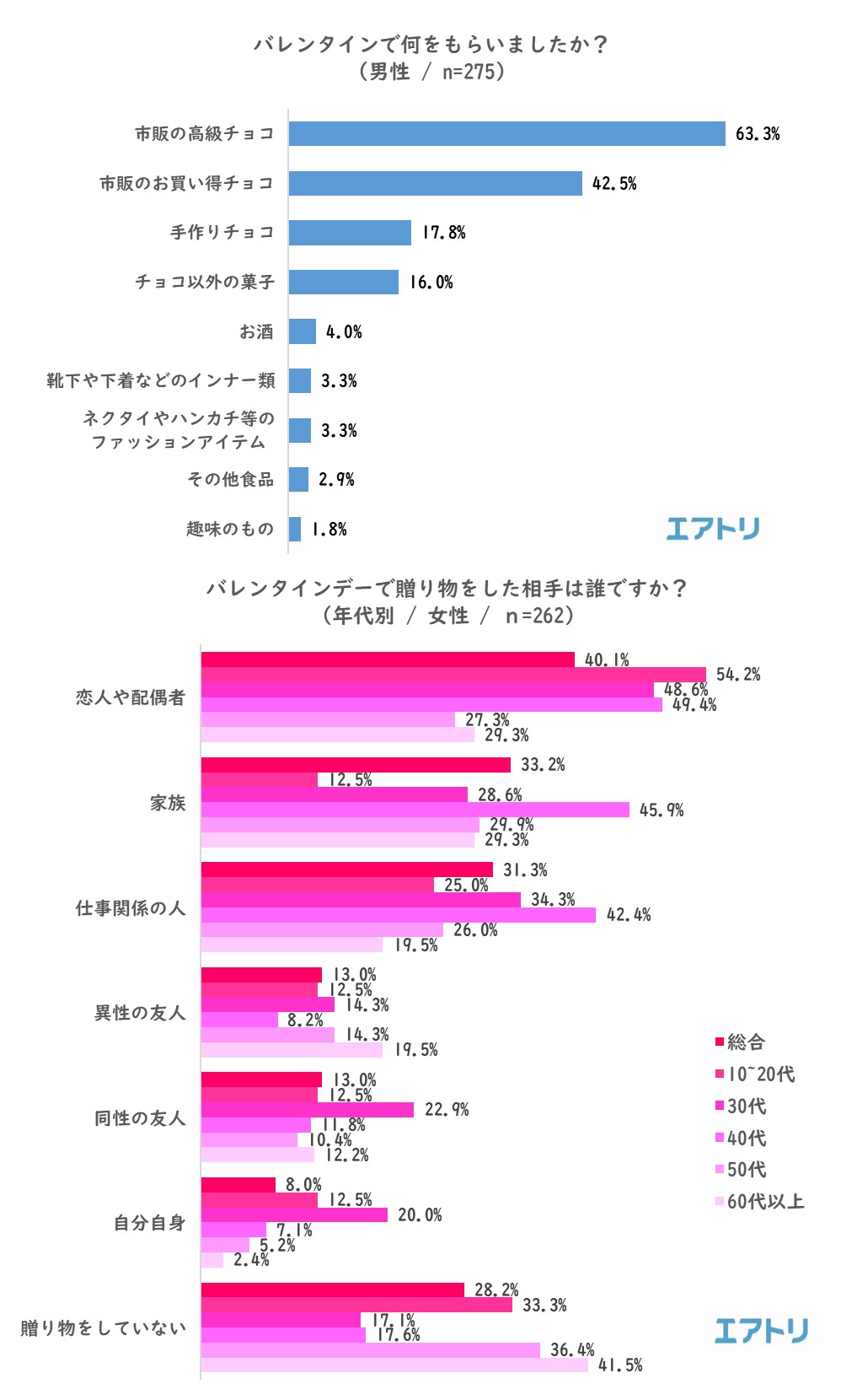 総合旅行プラットフォーム「エアトリ」(https://www.airtrip.jp/)を運営する株式会社エアトリ(本社:東京都新宿区、代表取締役社長:吉村 英毅、以下エアトリ)は、10代~70代の男女606名を対象に「バレンタインデーとホワイトデー」に関する調査を実施しました。
