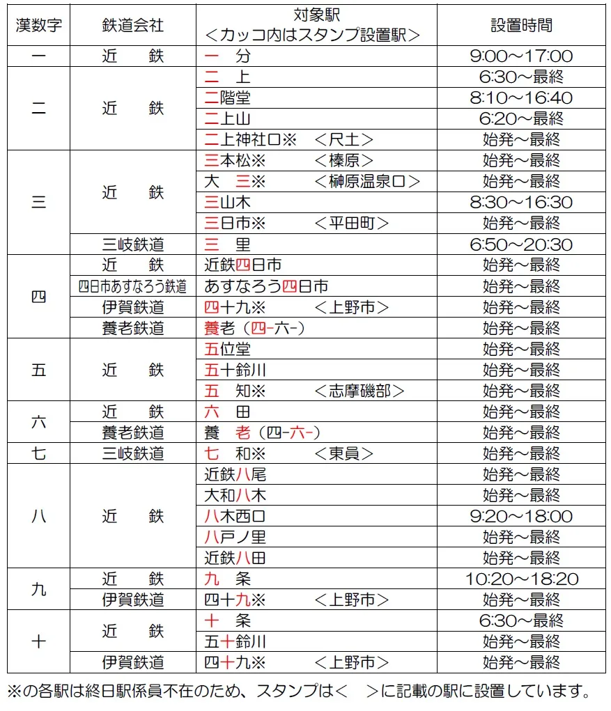 購入時にお渡しするスタンプラリー台紙に、駅名に漢数字が含まれ