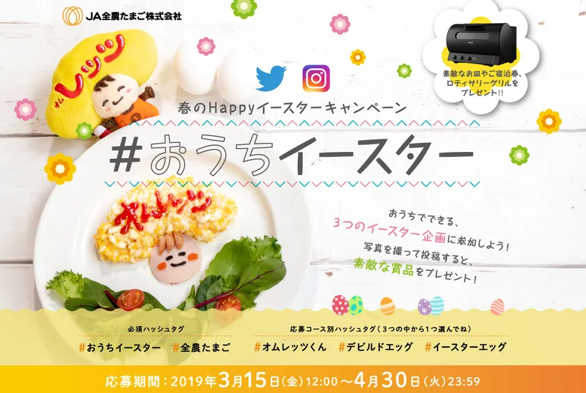 JA全農たまご株式会社(本社:東京都千代田区、代表取締役社長:小島 勝)は、2019年3月15日より、素敵なお皿やご宿泊券、ロティサリーグリルをプレゼントする「春のHAPPYイースターキャンペーン #おうちイースター」を開催いたします。