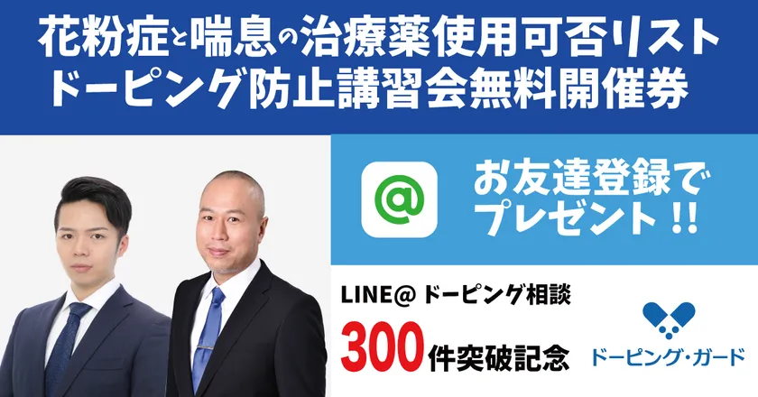 ドーピング相談件数300件突破記念! LINE@へのお友達登録で 花粉症薬・喘息治療薬の使用可否リストなどをプレゼント!
