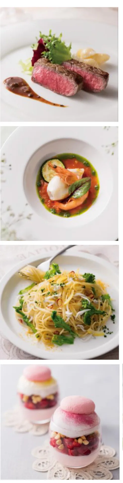 ランチは、トリュフソースで味わう「サーロインステーキ」や「海老とヤリイカのグリエ」、柚子の香りがアクセントの「菜の花とシラスのペペロンチーノ」など旬の味わいを心ゆくまで楽しめます。