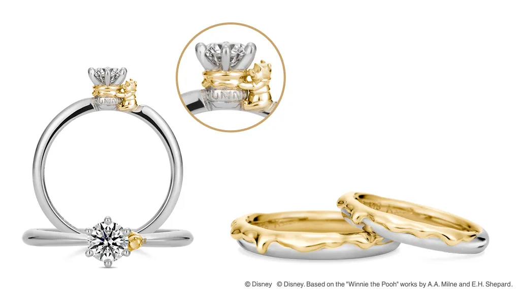 2016年8月には初めて「くまのプーさん」の婚約指輪、結婚指輪「Winnie the Pooh “Sweet Honey”」を発売。「ハチミツ」と「愛しい人」の意味を掛けた“Sweet Honey”は、身に着ける人が甘くて素敵な時間を過ごせますようにと願いがこめられています。