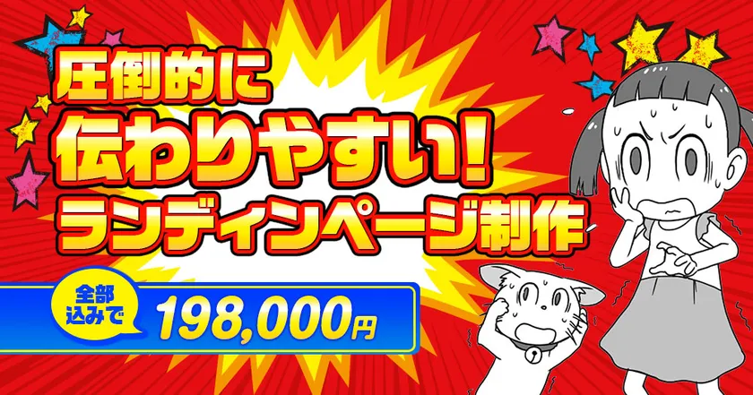 ・商業漫画での伝え方を熟知した商業漫画家が、毒舌でズバッと伝える5歳児のキャラクター「マーちゃん」とツッコミ猫のキャラクター「シラコちゃん」が商品やサービスをわかりやすく伝える漫画を作成し、それをLPにします。