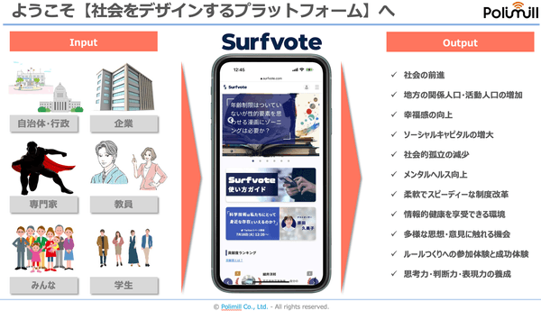 Surfvoteは社会課題に特化し、ユーザーがあらゆるテーマについて自分の意見を投票できるだけでなく、他のユーザーの意見を傾聴できるサービスです。地方公共団体版のSurfvoteも拡充中で自治体と連携し住民による住みやすい街づくりを促進します。あらゆる人がルール作りに参加し、価値観の変化やテクノロジーの進化に合わせた柔軟でスピーディーな制度改革ができるような社会を、SNSとテクノロジーで実現させます。