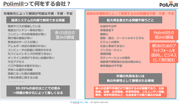 Polimill社はこうした社会の問題や困りごとを解決するためのプラットフォームを模索・開発・提供・運用し、そしてこれをビジネスとして取り組むことを目指しています。