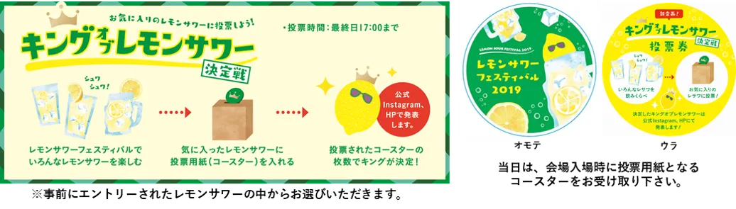 ご来場いただいたお客さまの投票で、各会場で1番人気のレモンサワーを決定いたします。キングの座を手にするのは、「元祖系レモンサワー」か「進化系レモンサワー」か!?