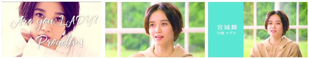 本動画には、大人ニキビにも対応したニキビケア商品「プロアクティブ+」のイメージキャラクター・宮城舞さんにご出演いただきました。動画中では宮城さんが素顔を披露し、4STEPで大人のニキビケアの方法をレクチャーします。宮城さんのナチュラルな素顔とファッショナブルな姿を見ることができる動画となっております。