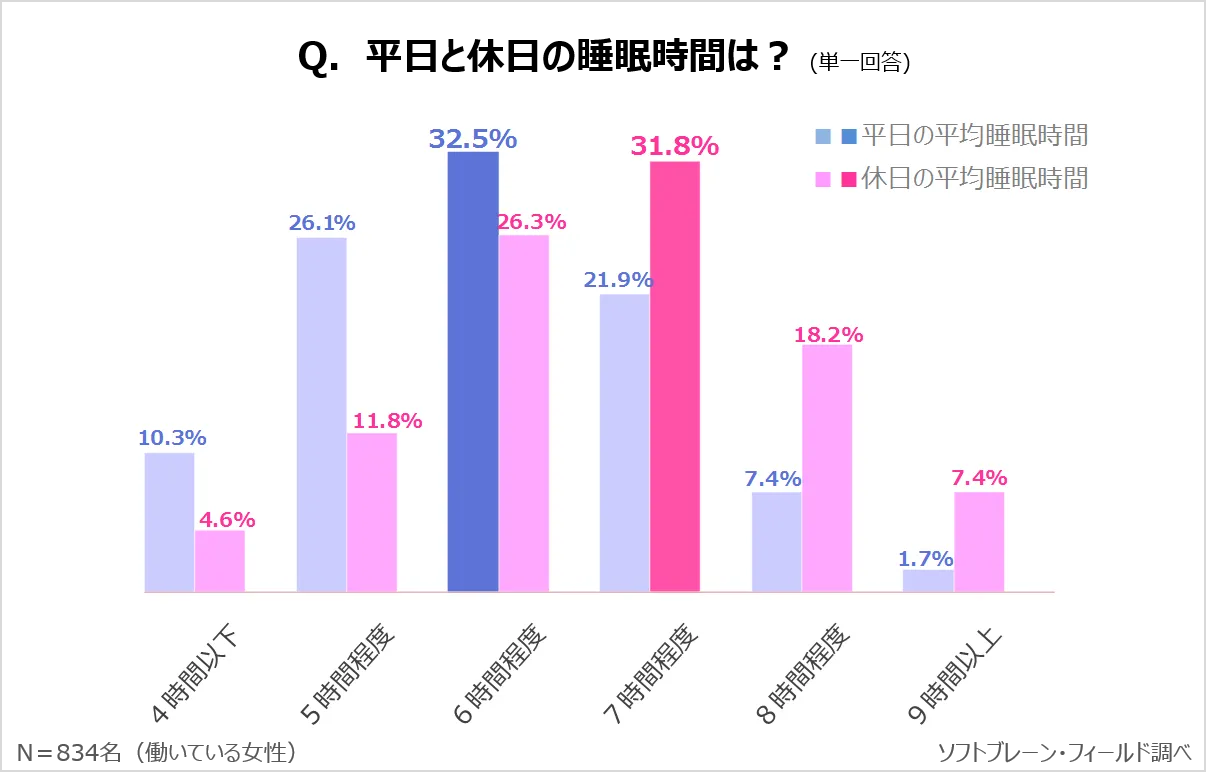 まず、平日の睡眠時間の平均は、「6時間程度」が32.5%でもっとも多く、「5時間程度」が26.1%と続き、全体の約7割の方が、「6時間未満」と回答しました。その一方で休日の睡眠時間の平均は、「7時間程度」が31.8%でもっとも多く、全体の約6割の方が「7時間以上」と回答しました。
