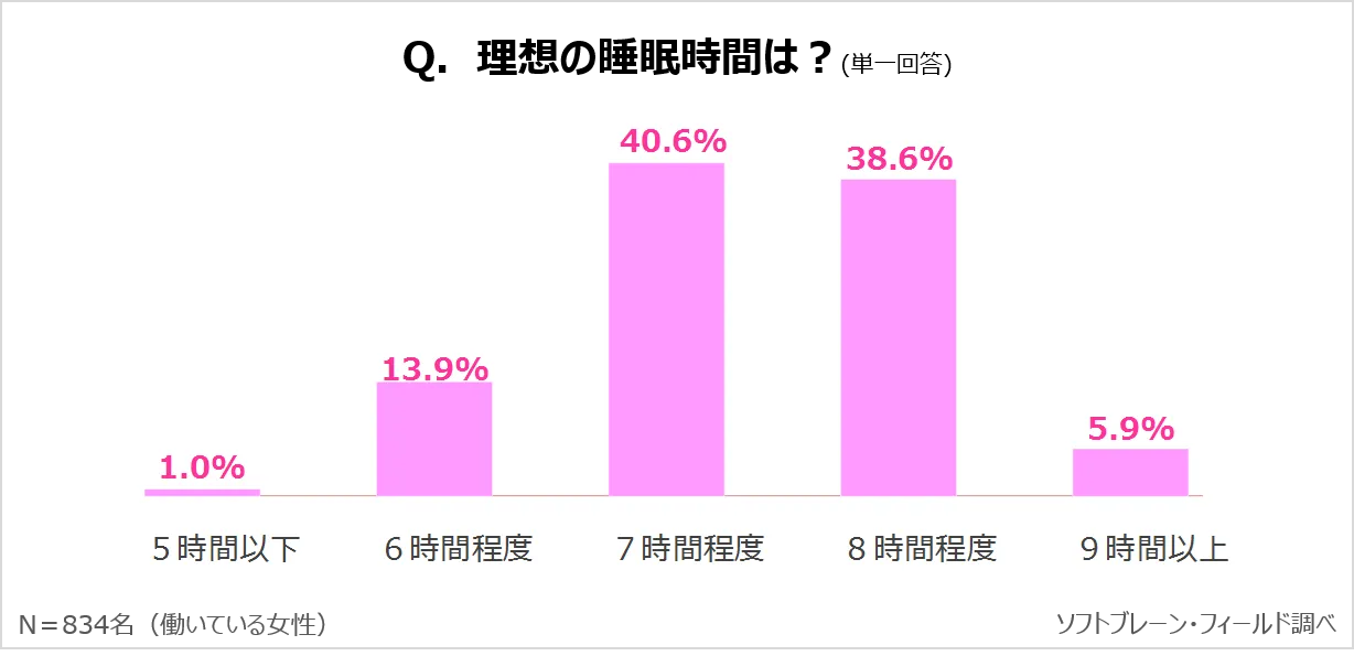 今回のアンケートでは、全体の6割近くの人が「(1日に)約6~7時間」の睡眠時間を得ていることが明らかとなりましたが、理想としては「あと1、2時間は寝たい」など、睡眠不足を自覚する人が目立ちました。