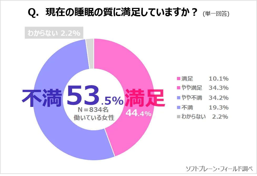 現在の睡眠の質について、「不満だと感じている」が53.5%で、「満足だと感じている」44.4%を上回りました。
