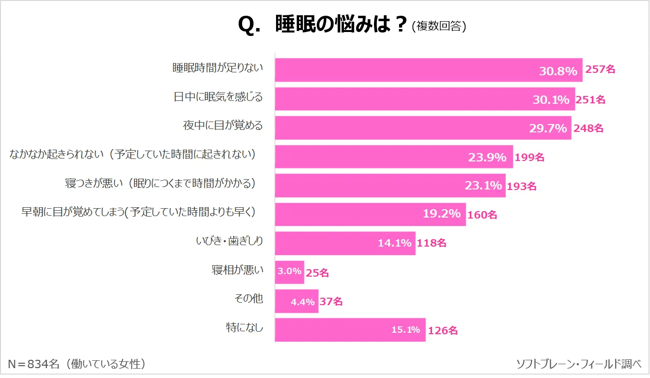 ・睡眠の悩みは、「睡眠時間が足りない」が30.8%で最多となり、「日中に眠気を感じる」が30.1%、「夜中に目が覚める」が29.7%と続く。