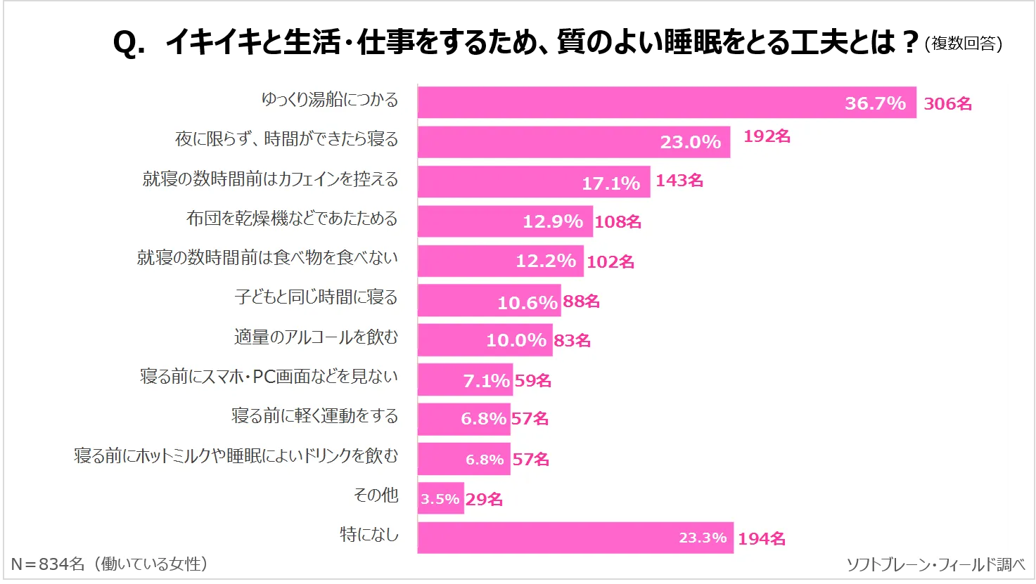 質のよい睡眠をとる工夫は、「ゆっくり湯船につかる」が36.7%でもっとも多く、「夜に限らず、時間ができたら寝る」が23.0%、「就寝の数時間前はカフェインを控える」が17.1%となりました。