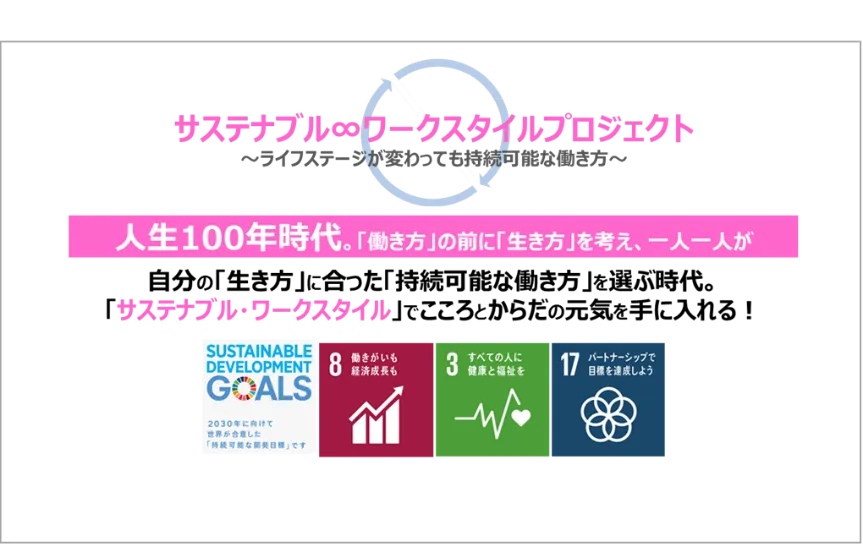 働く(社会とかかわる機会・社会参画)=見守りあう機会と定義し、今後、賛同パートナーと共に「サステナブル∞ワークスタイル」プロジェクトを推進いたします。